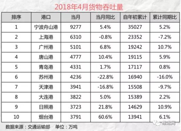 日前,交通运输部公布了2018年4月规模以上港口港口货物吞吐量。